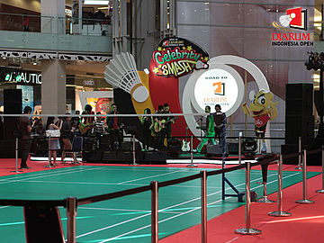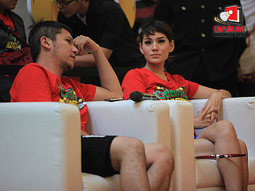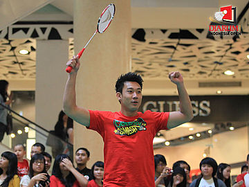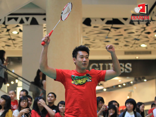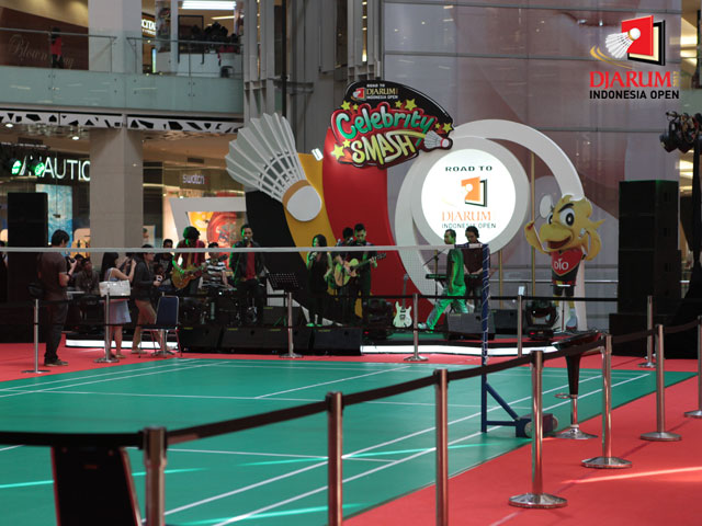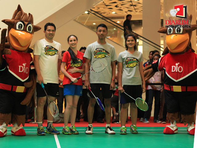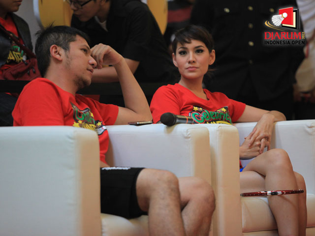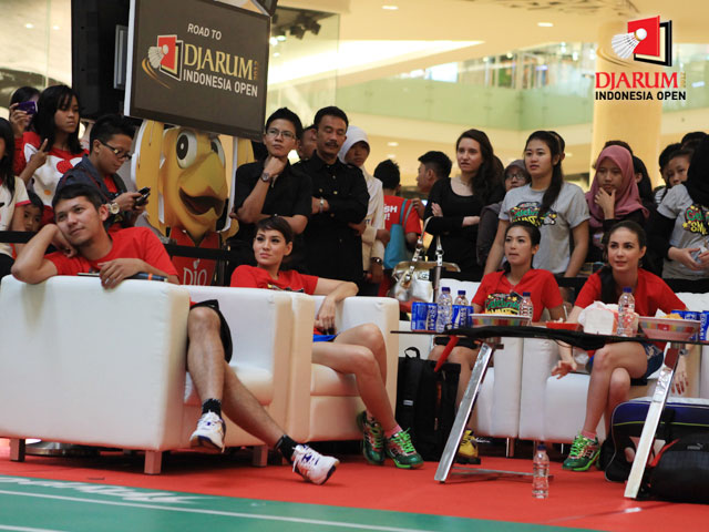 Ekspresi Denny Sumargo usai berhasil memasukan kok.