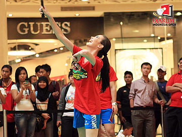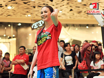 Arumi Bachsin berusaha memukul kok yang dilayangkan lawannya audiens terpilih