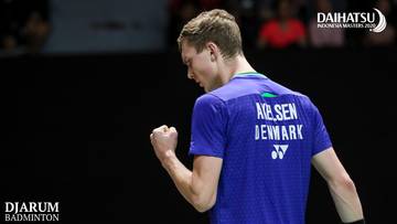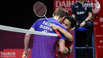 Anthony Sinisuka GINTING (Indonesia) dan Viktor AXELSEN (Denmark) berpelukan seusai bertanding