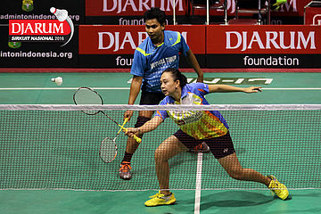 Didit Juang/Keshya Nurvita (Trikus Badminton/Berkat Abadi) Mengembalikan Shuttlecock.