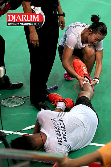 Ardiansyah Putra (Berkat Abadi Banjarmasin) mendapatkan pertolongan dari partnernya, Devi Tika saat terjatuh