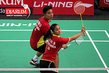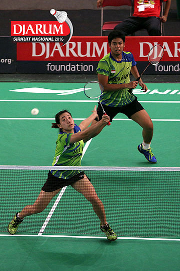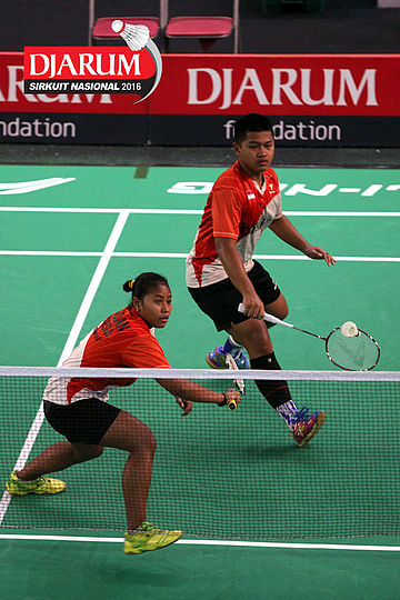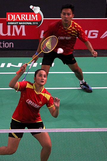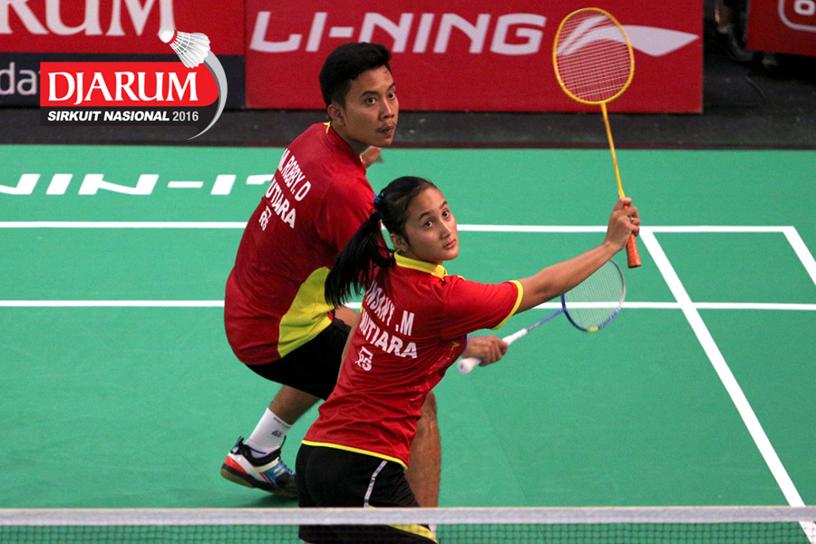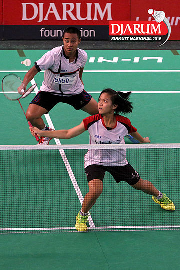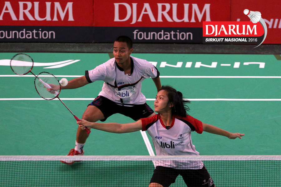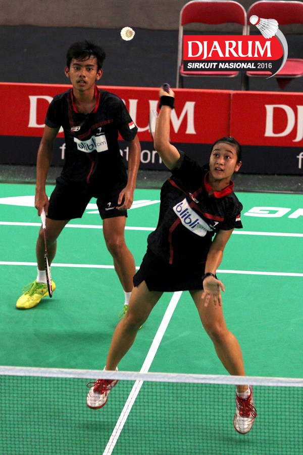 Pramudya Kusumawardana/Lisa Ayu (Djarum Kudus) bersiap menyambar pengembalian tanggung