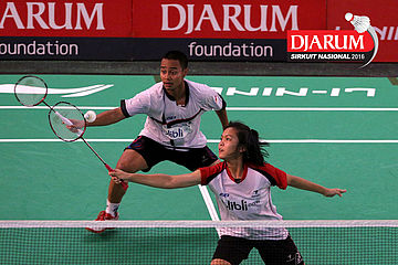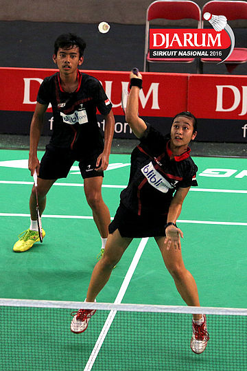 Irfan Fadhillah/Weni Anggraeni (Jaya Raya) mengembalikan shuttlecock