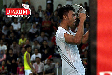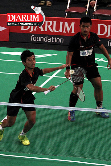 Helmi Abbu/Rehan Naufal (Djarum Kudus) mengembalikan shuttlecock