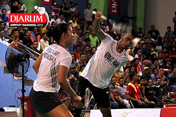 Ardiansyah Putra/Devi Tika (Berkat Abadi Banjarmasin) mengembalikan shuttlecock