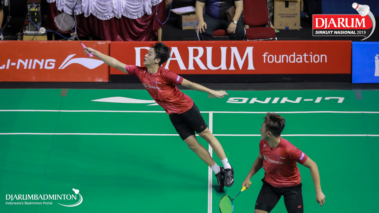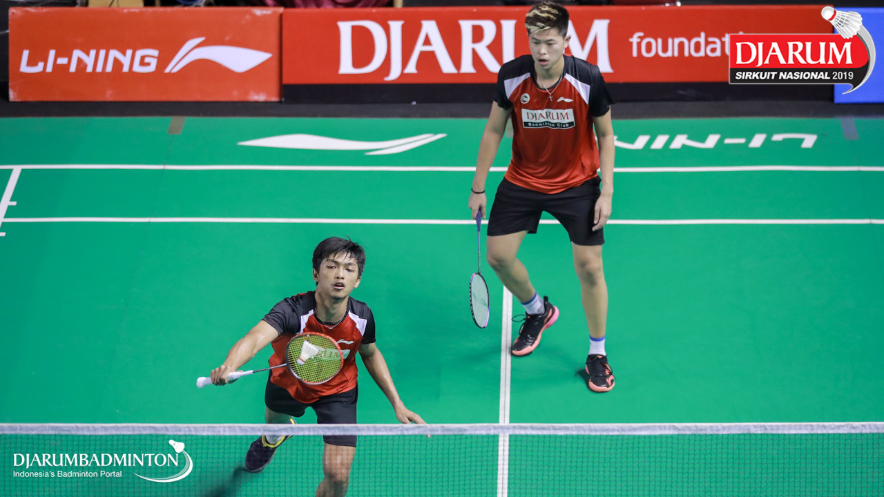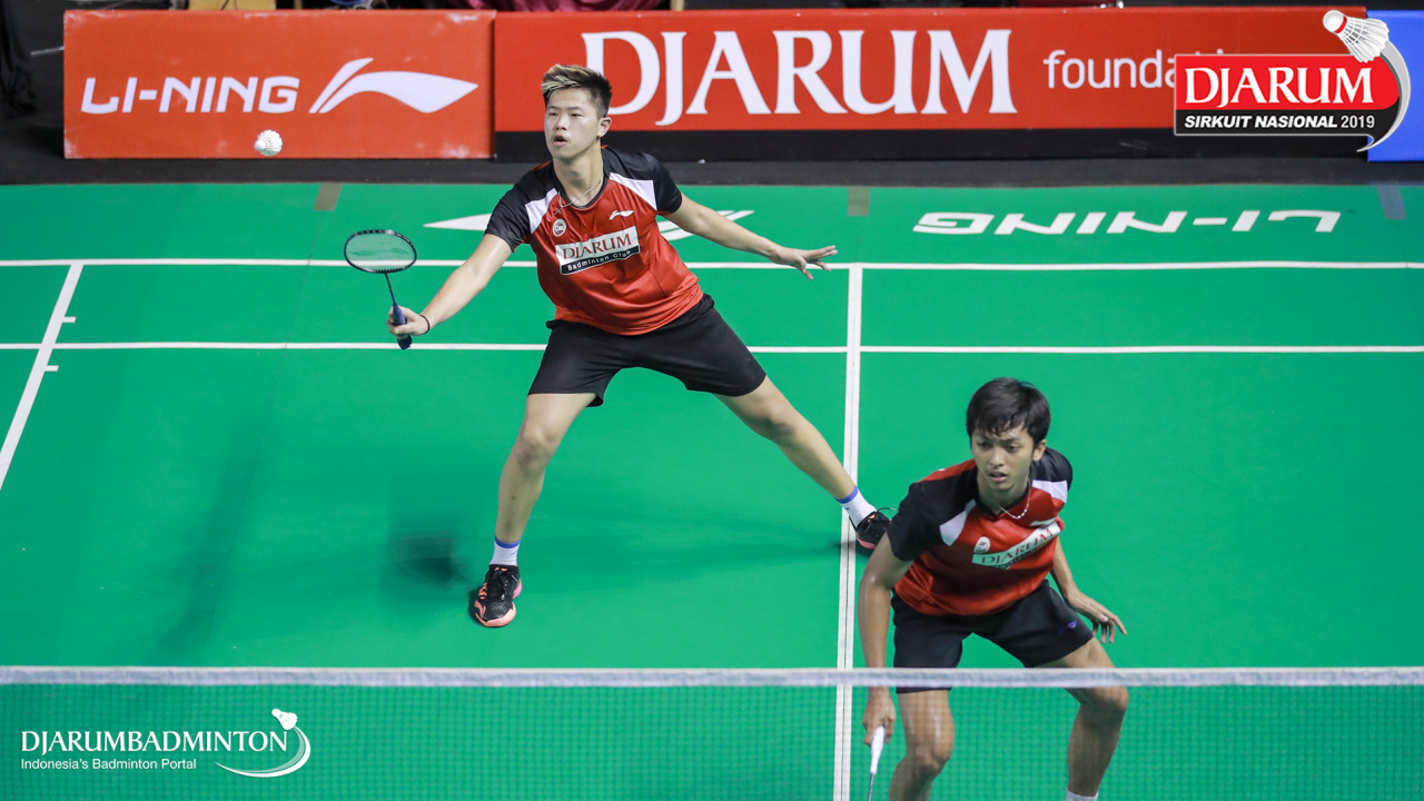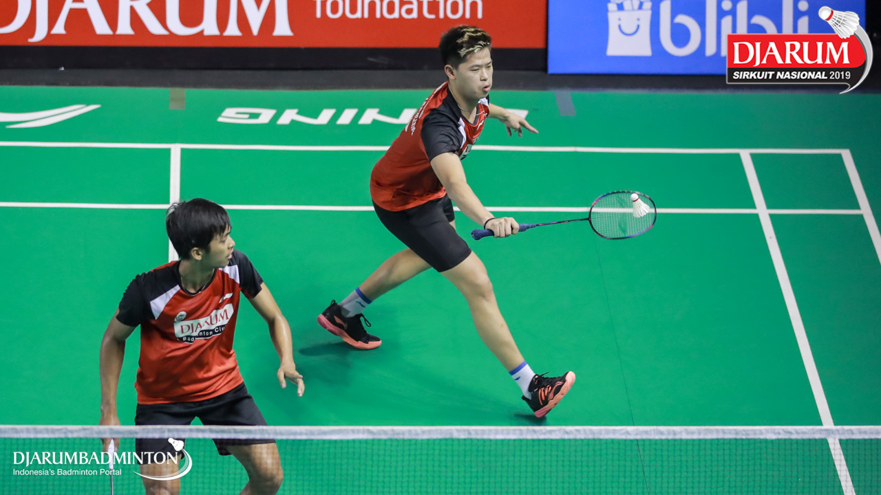 Ivan Adi Cahyono+Vincentius Suwarland (PB Djarum, Kudus) menyambut shuttlecock