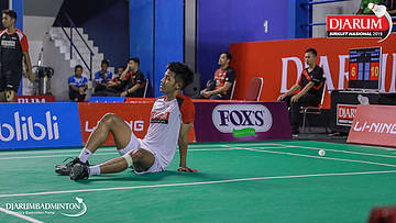 Bagas Kristianto Nugroho (PB Djarum, Kudus) terjatuh