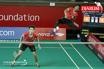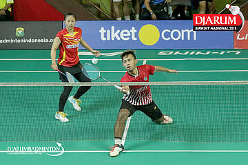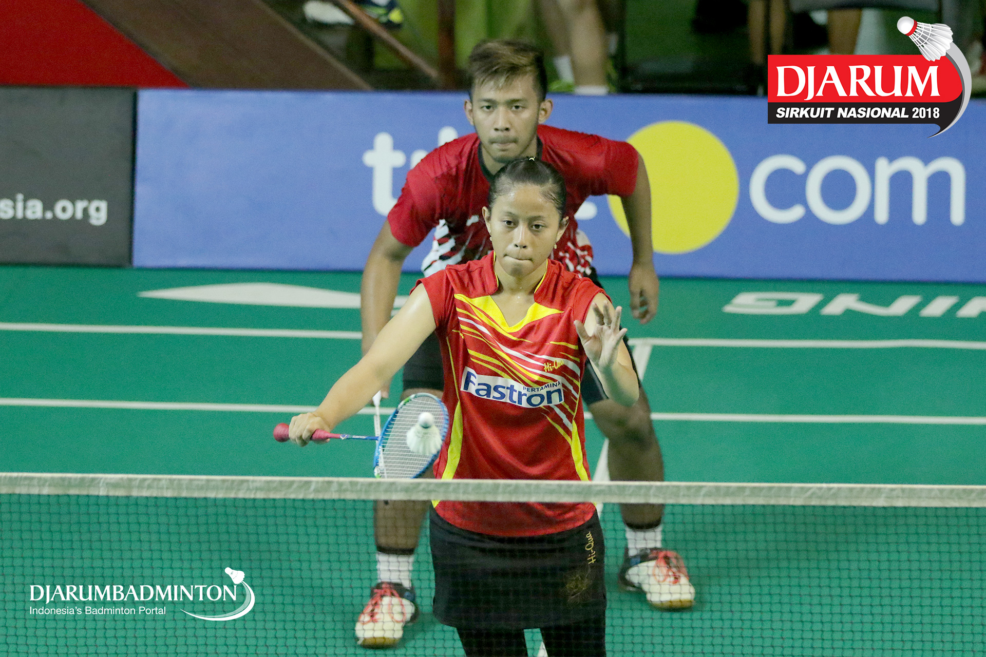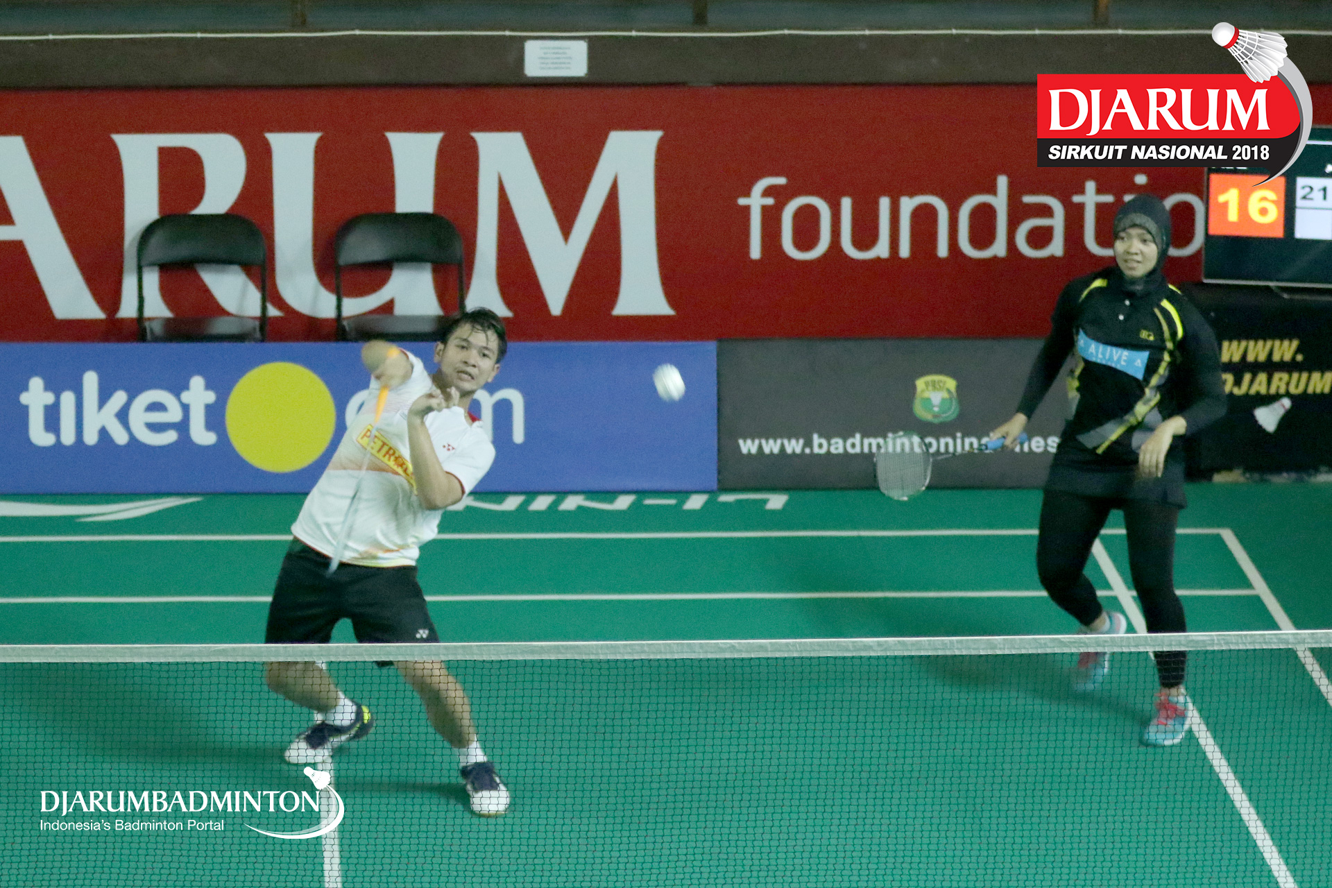 Rizko Asuro/Brigita Marcelia Rumambi (Pertamina Fastron, Jakut/Berkat Abadi, Banjar) bersiap menyambar pengembalian
