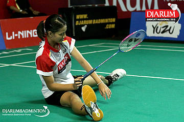 Alifia Intan Nurrokhim (PB Djarum, Kudus) terjatuh saat berusaha mengembalikan shuttlecock