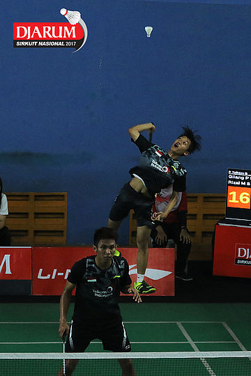 Gilang Pratama Restu Nugraha/Rizal Muhammad Sofyan (Pusdiklat Telkom Bandung) Bersiap Melakukan Smash