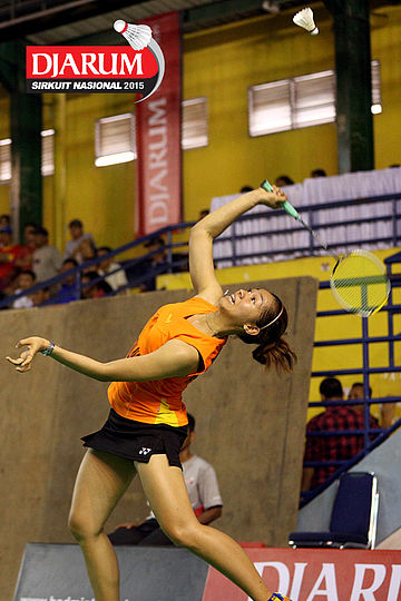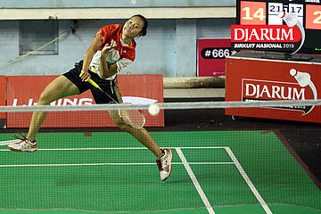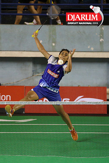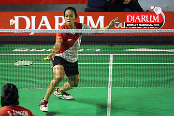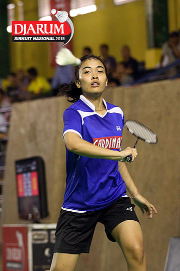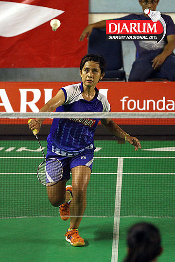Linda Mutiara (Mutiara Cardinal) mengembalikan shuttlecock ke arah Rafika Mutiara (Candra Wijaya).
