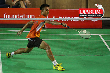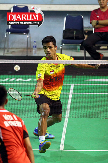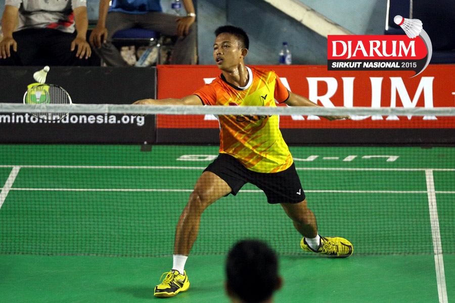 Redy Perdana (Pelatnas) bersiap menyambut pengembalian dari Nugroho Andi (JR Enkei).