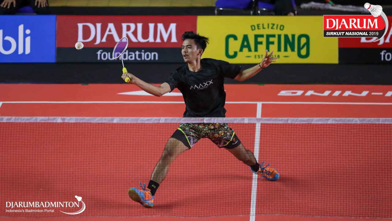 Andika Ferdiaz (PB. Rudy, Mataram) bersiap menyambut shuttlecock