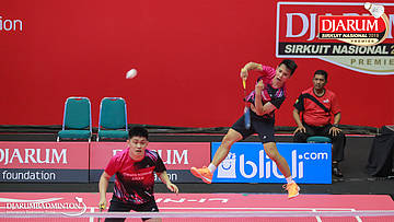 Riyanto Subagja+Sapto Susilo (Pertamina Fastron, Jakut+PB Trinox Badminton Club, Jaktim) menyambut shuttlecock