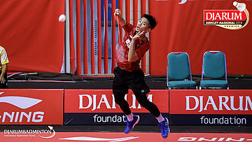 Bagas Kristianto Nugroho (PB Djarum, Kudus) menggapai shuttlecock