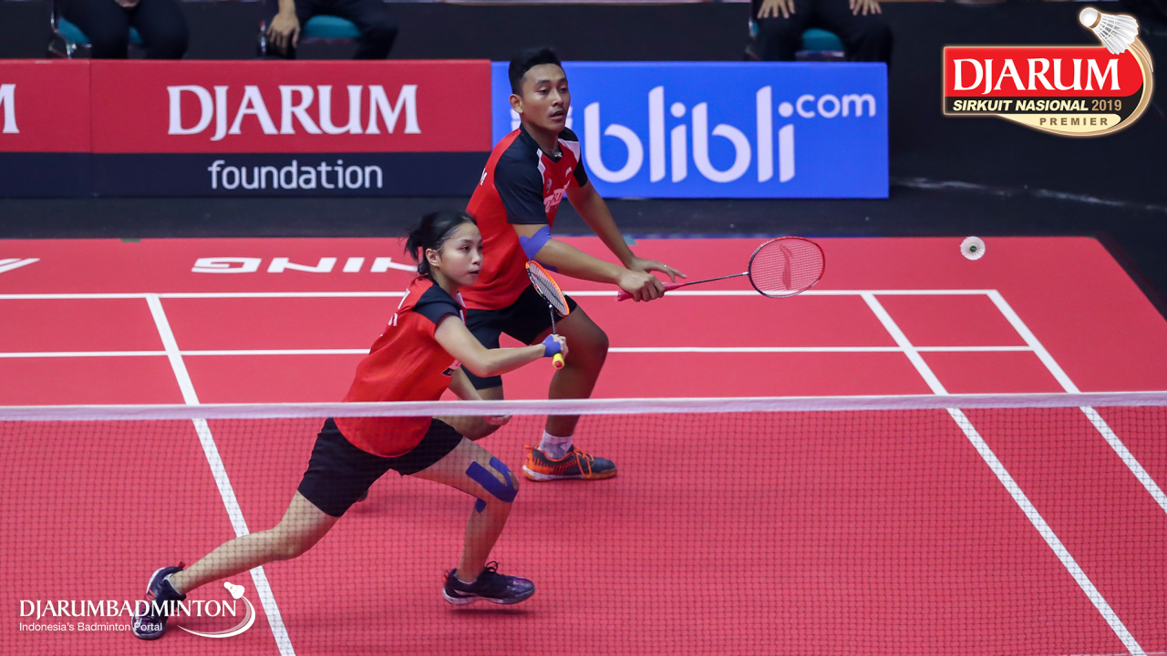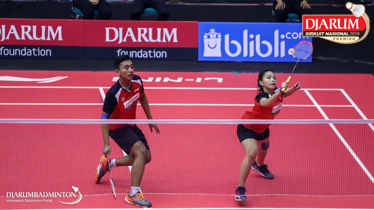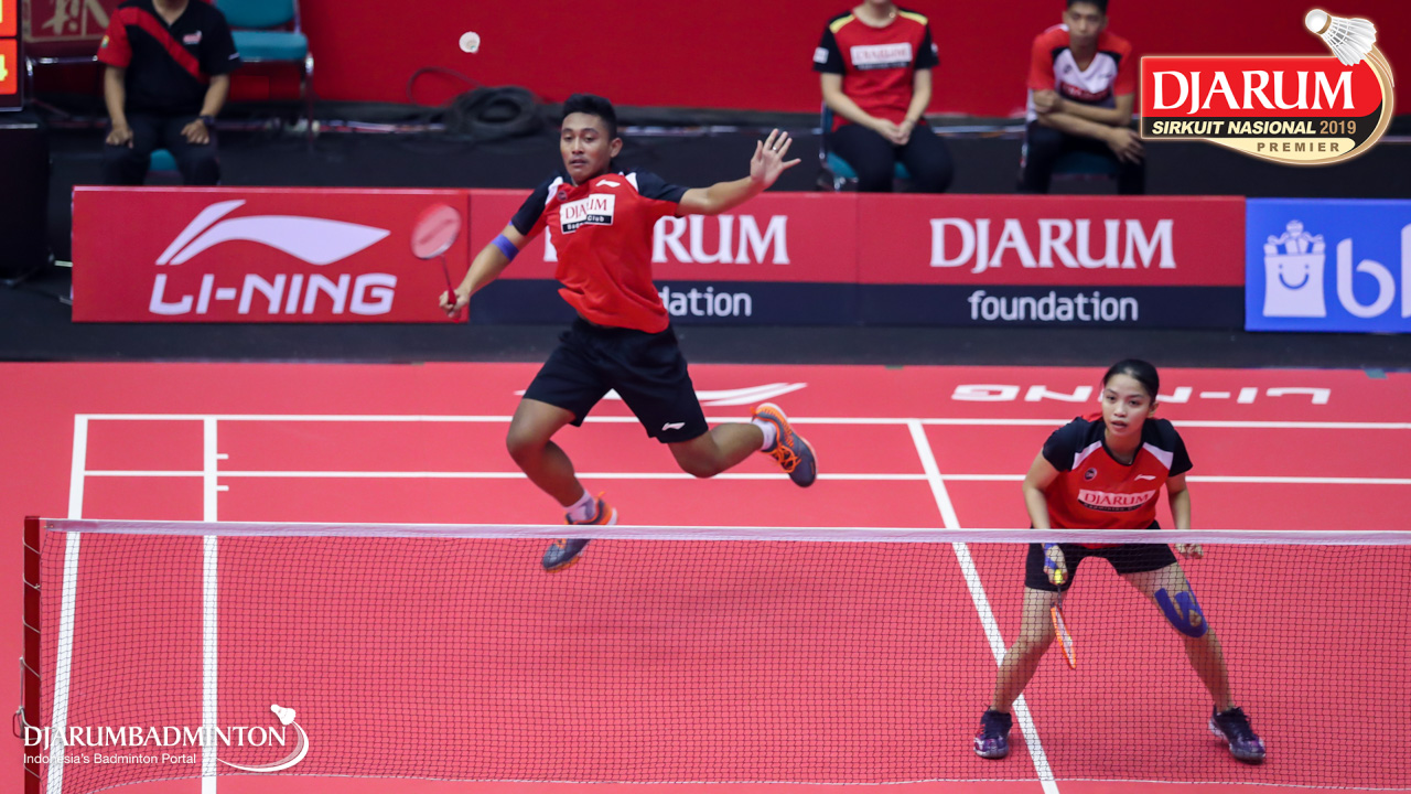 Arya Adi Saputra+Putri Larasati (Exist Badminton Club) bersiap melepaskan serangan