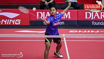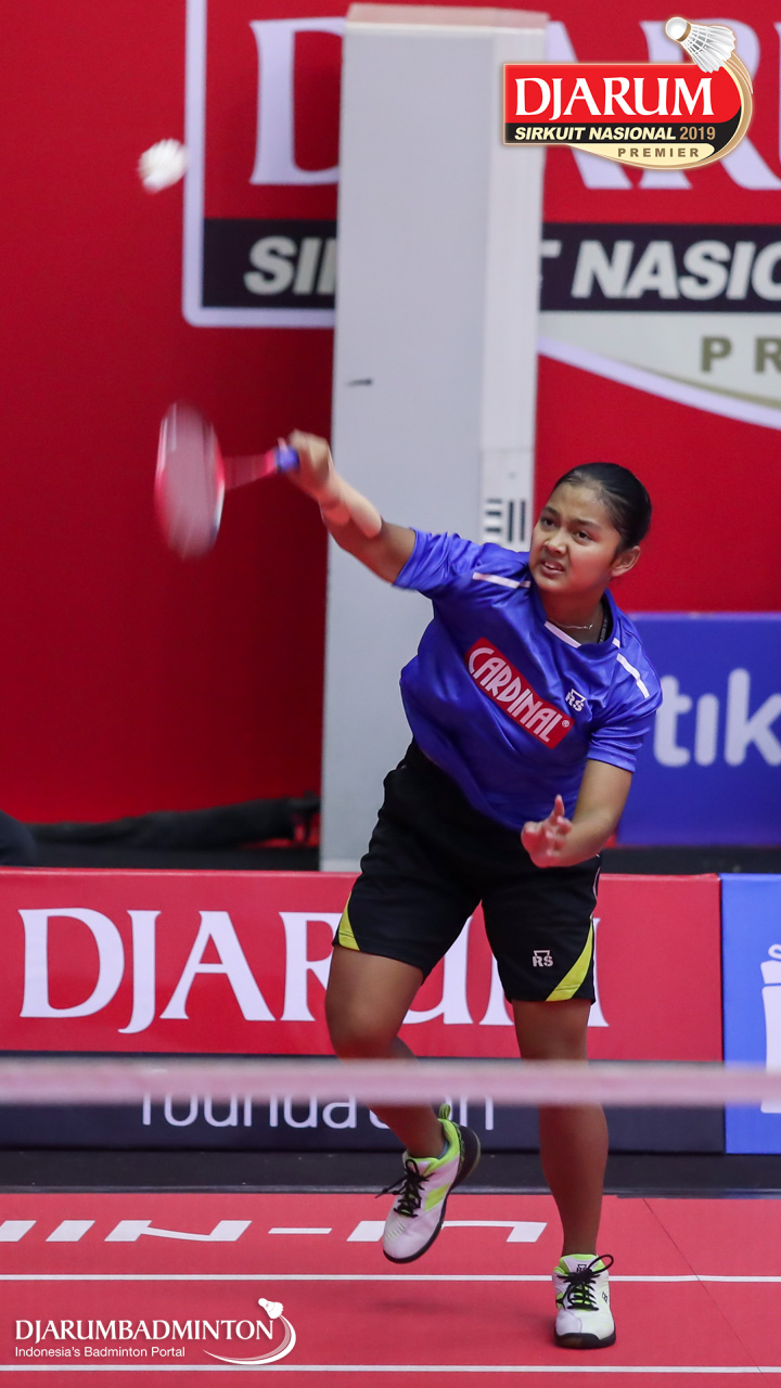 Gina Revina Aristy (Mutiara Cardinal, Bandung) bersiap menyambut shuttlecock