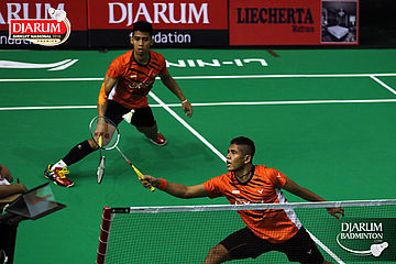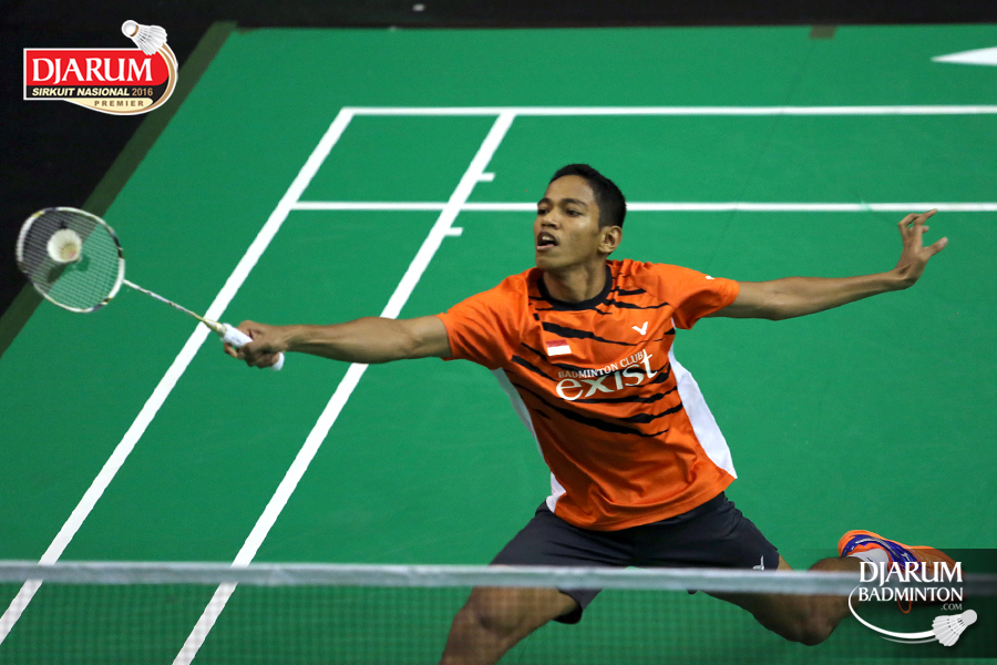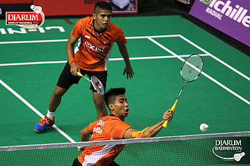 Franky Wijaya/Sabar Karyaman (Exist) mengembalikan shuttlecock