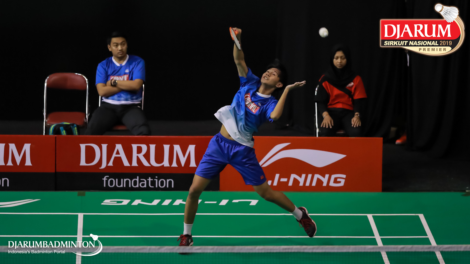 Auditya Alpha Hidayat (Mutiara Cardinal, Bandung) bersiap menyambar shuttlecock
