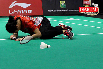 Melsya Nur Fitriani (PB Victory Bogor) Terjatuh Saat Berusaha Menggapai Pengembalian