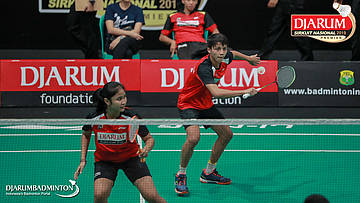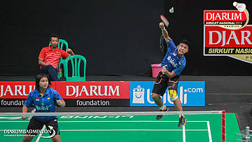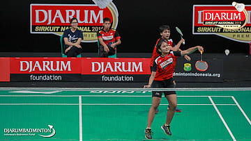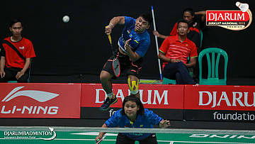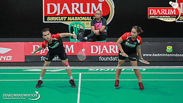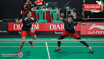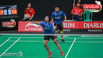 Asghar Herfanda+Sang Ayu Putu Kharisma Maharani (PB Djarum, Kudus) bersiap menyambut shuttlecock