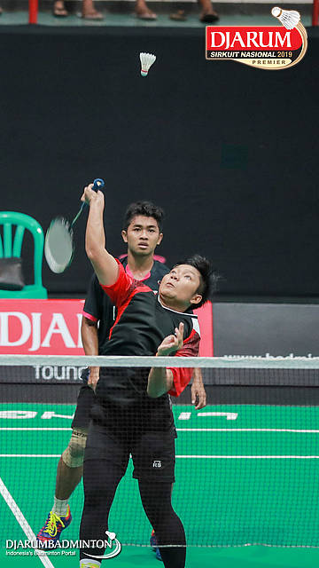 Amri Syahnawi+Masita Mahmudin (Jaya Raya Jakarta) berusaha menggapai shuttlecock