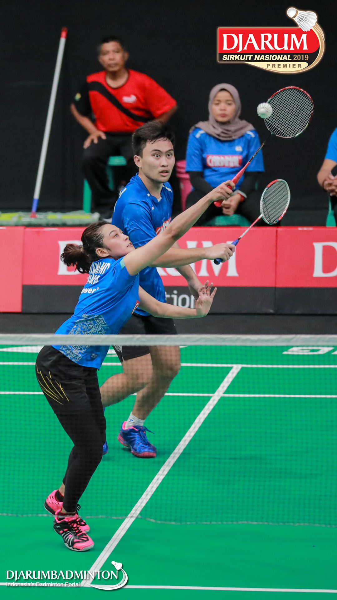 Reinard Dhanriano+Maretha Dea Giovani (Mutiara Cardinal, Bandung) berusaha mengembalikan shuttlecock