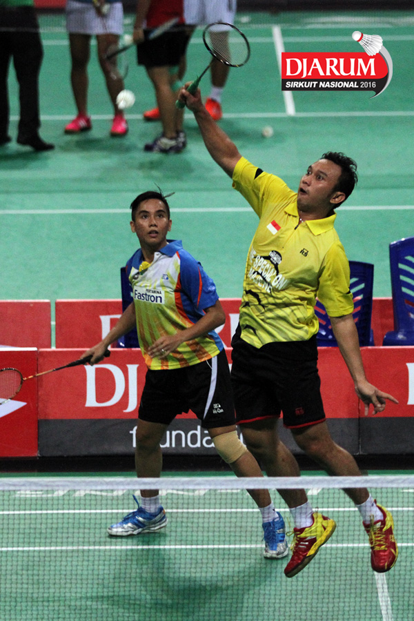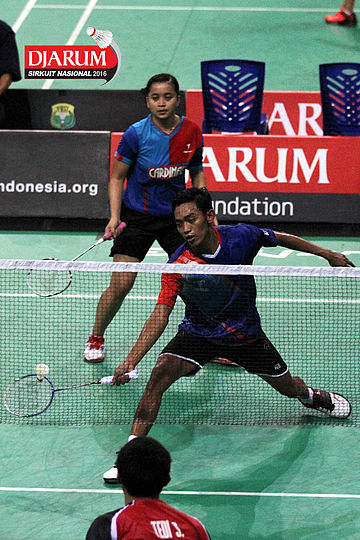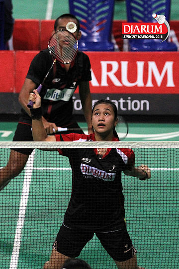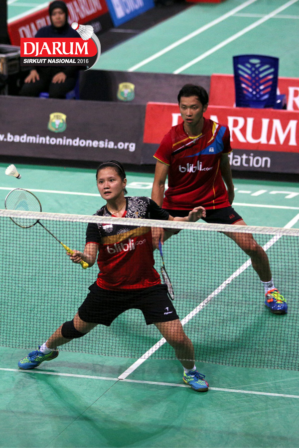 Pramudya Kusumawardana/Lisa Ayu (Djarum Kudus) bersiap menyambar pengembalian tanggung