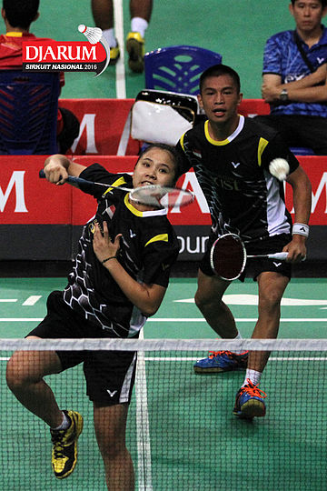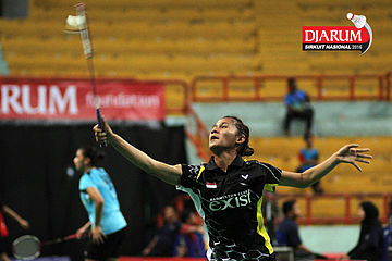 Trikusuma Wardhana/Nadya Melati (Exist/Pertamina Fastron) mengembalikan shuttlecock