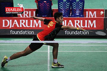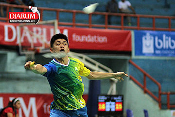 Riyanto Subagja (Djarum Kudus) mengembalikan shuttlecock