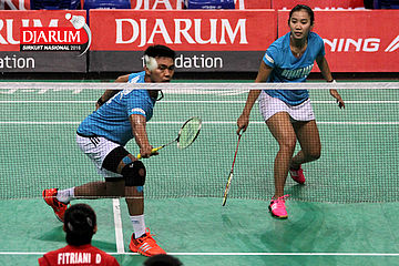 Fernando Kurniawan/Della Augustia (Djarum Kudus) mengembalikan shuttlecock