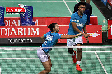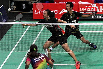 Lukhi Apri/Ririn Amelia (Djarum Kudus) melepaskan serangan