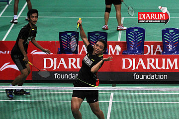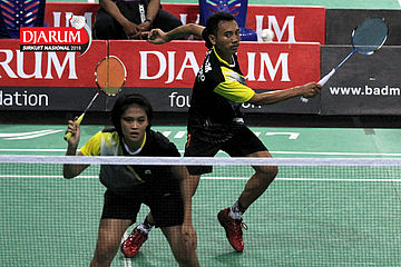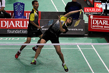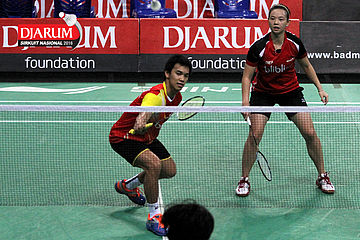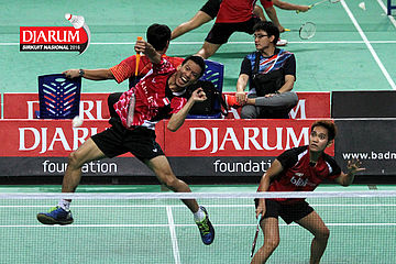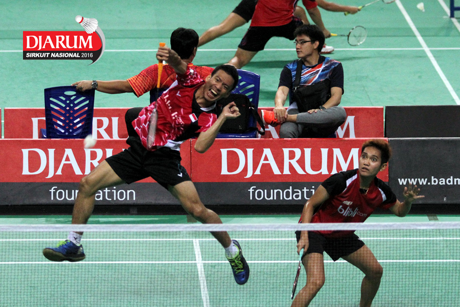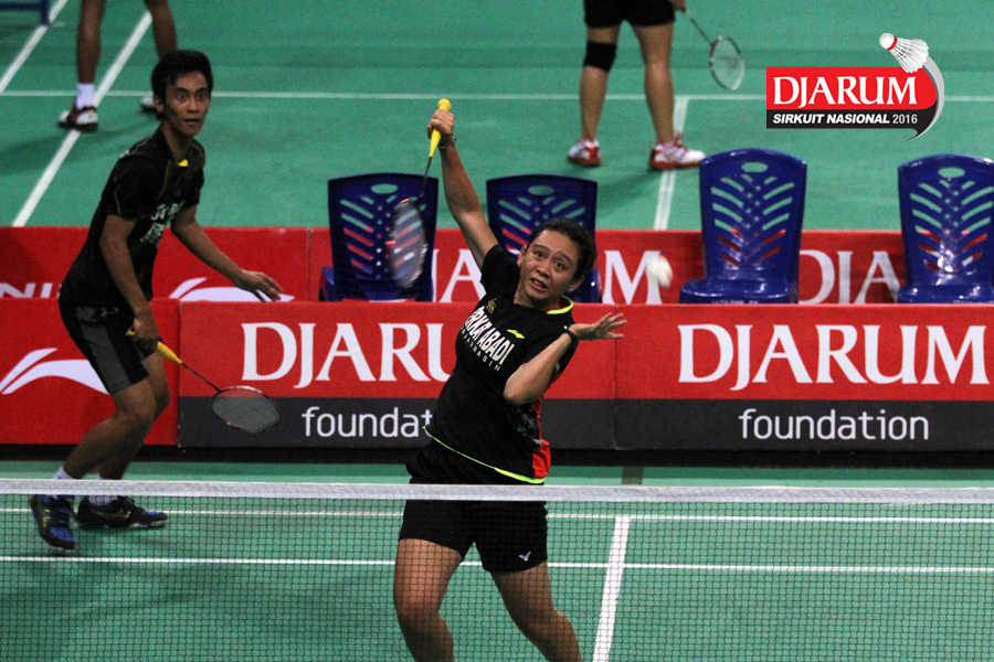 Bernadus Bagas/Febby Valencia (Djarum Kudus) bersiap menyambar pengembalian tanggung