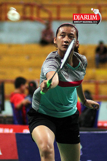 Mia Mawarti (Guna Dharma) mengembalikan shuttlecock