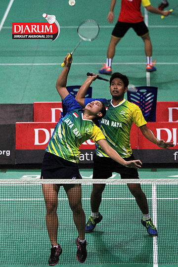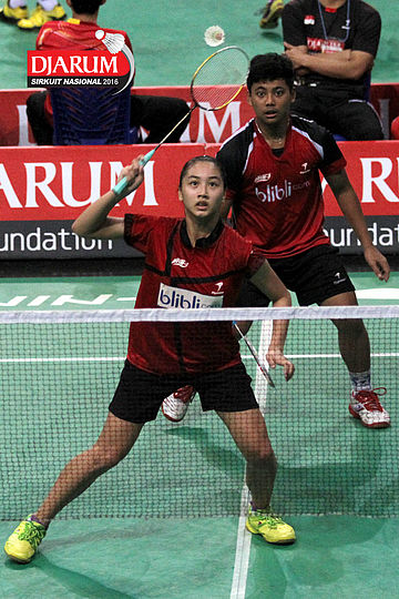 Irfan Fadhillah/Weni Anggraeni (Jaya Raya) bersiap menghadang serangan