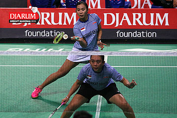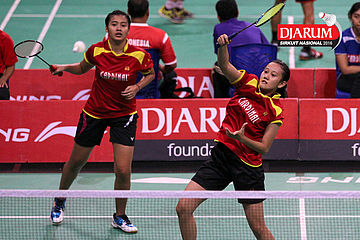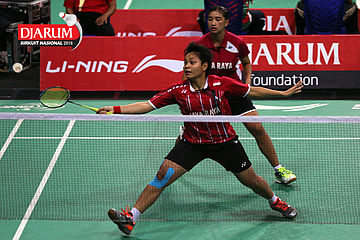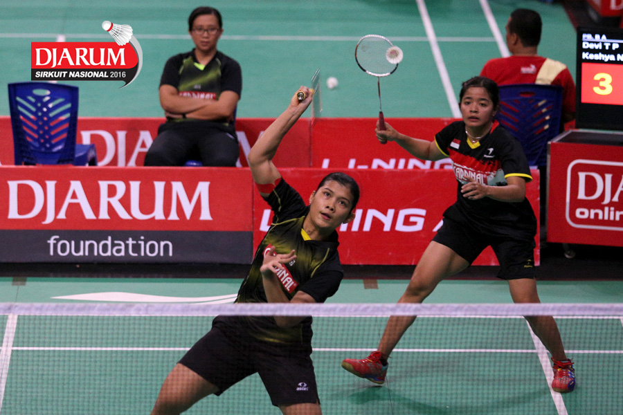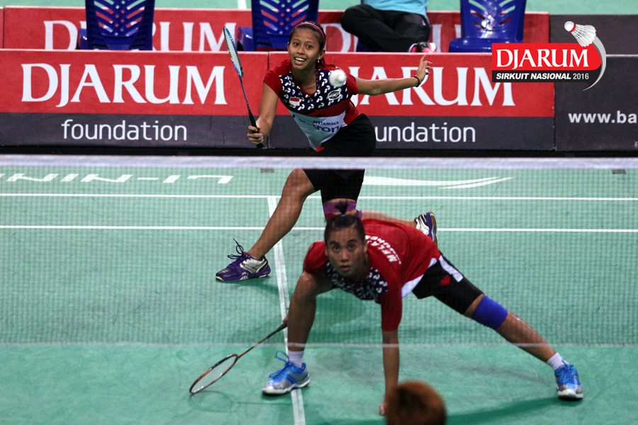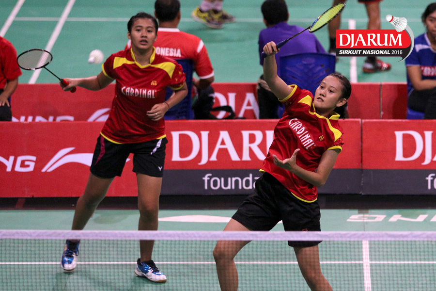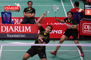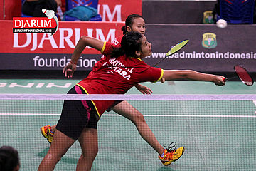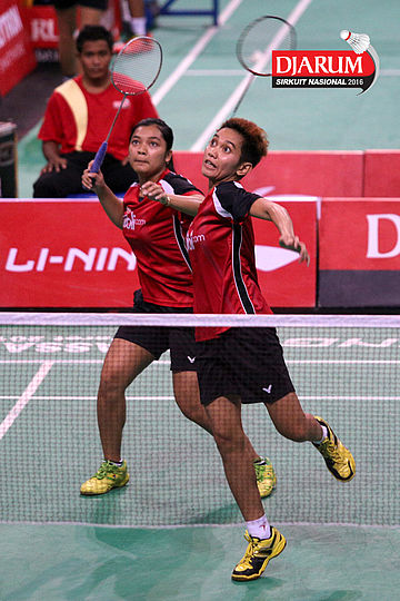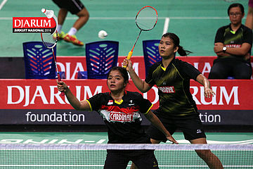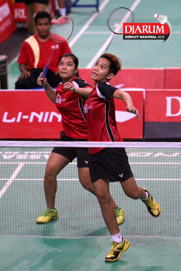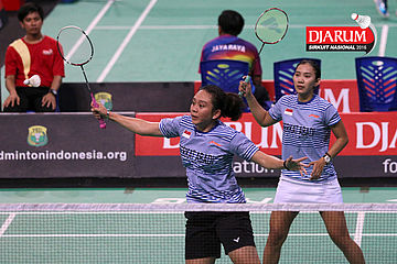 Ririn Amelia/Ristya Ayu (Djarum Kudus) bersiap menyambar pengembalian tanggung