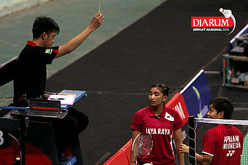 Apriani Rahayu/Jauza Fadhilla (Jaya Raya) mendapatkan kartu kuning dari umpire