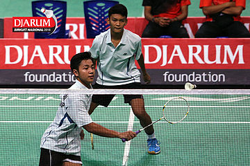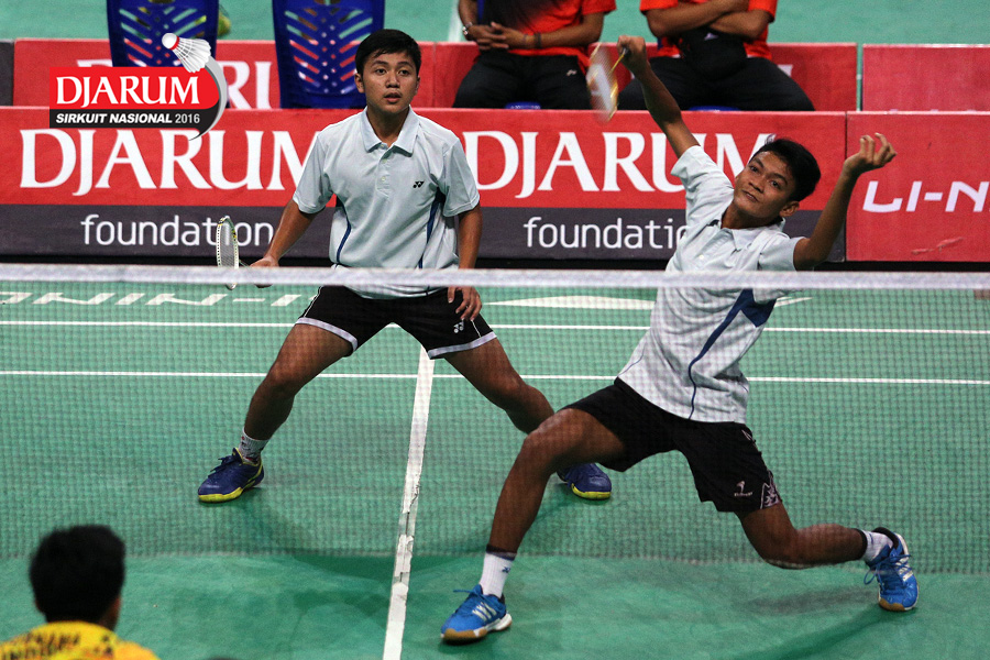 Abiyyu Fauzan/M. Shohibul (Pusdiklat Telkom) melepaskan serangan