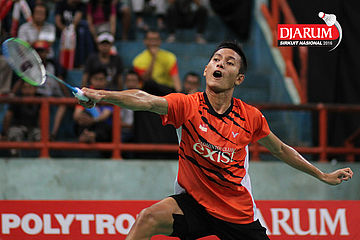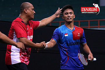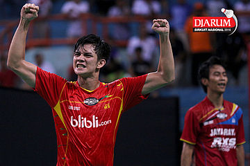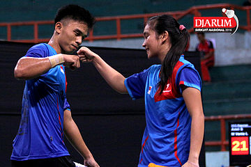 Selebrasi kemenangan Agripina Primarahmanto/Andrei Adistia (Jaya Raya/Djarum Kudus)