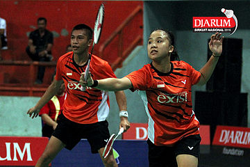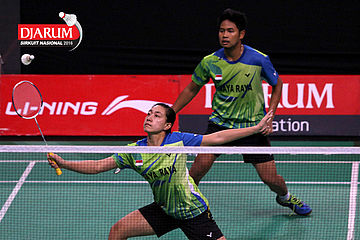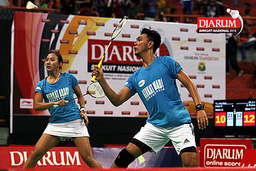 Irfan Fadhillah/Weni Anggraeni (Jaya Raya) mengembalikan shuttlecock