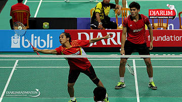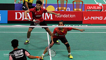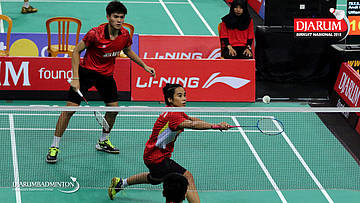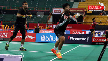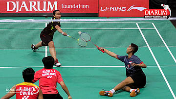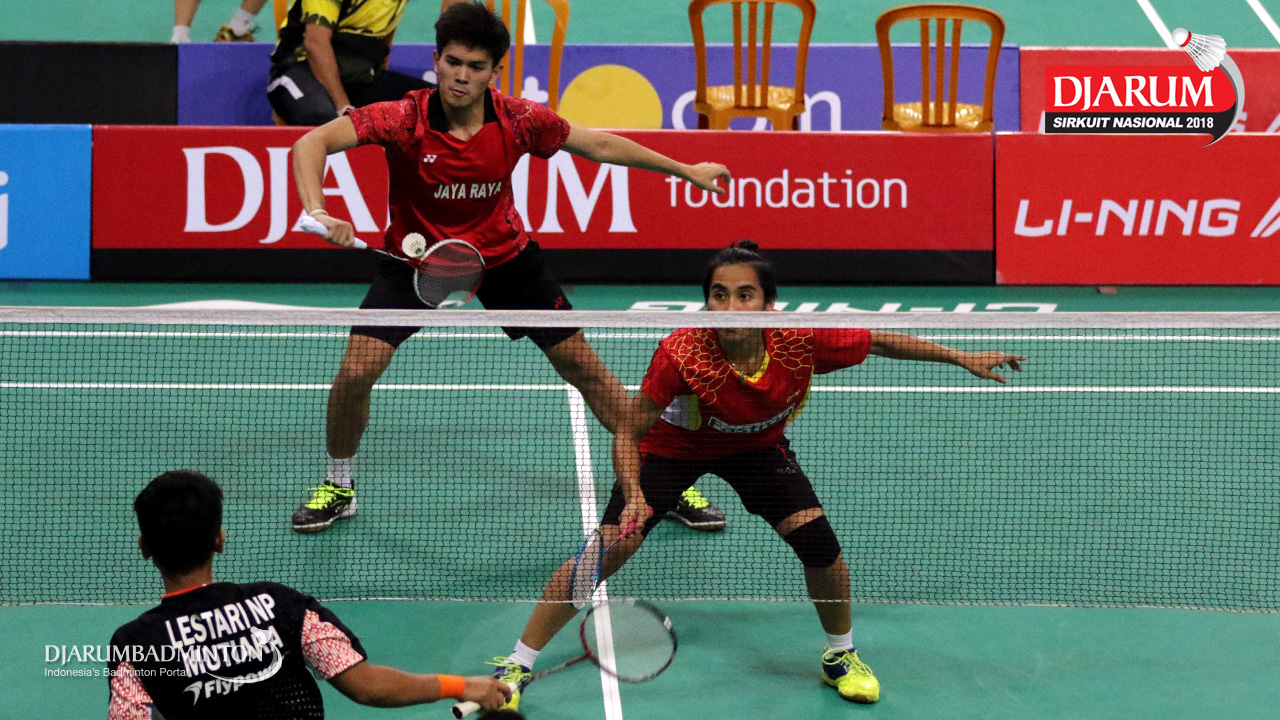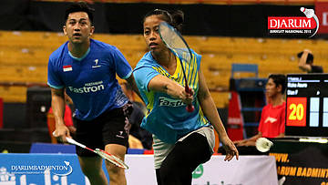 Adnan Maulana/Nadiya Melati (Jaya Raya Jakarta/Pertamina Fastron) menghadang pengembalian