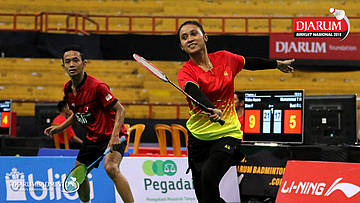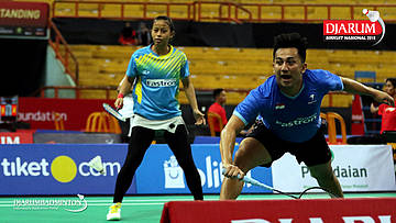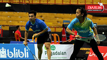 Adnan Maulana/Nadiya Melati (Jaya Raya Jakarta/Pertamina Fastron) mengembalikan shuttlecock
