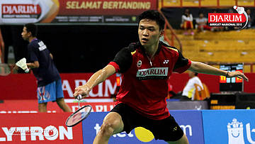 Bobby Setiabudi (PB Djarum Kudus) mengembalikan shuttlecock