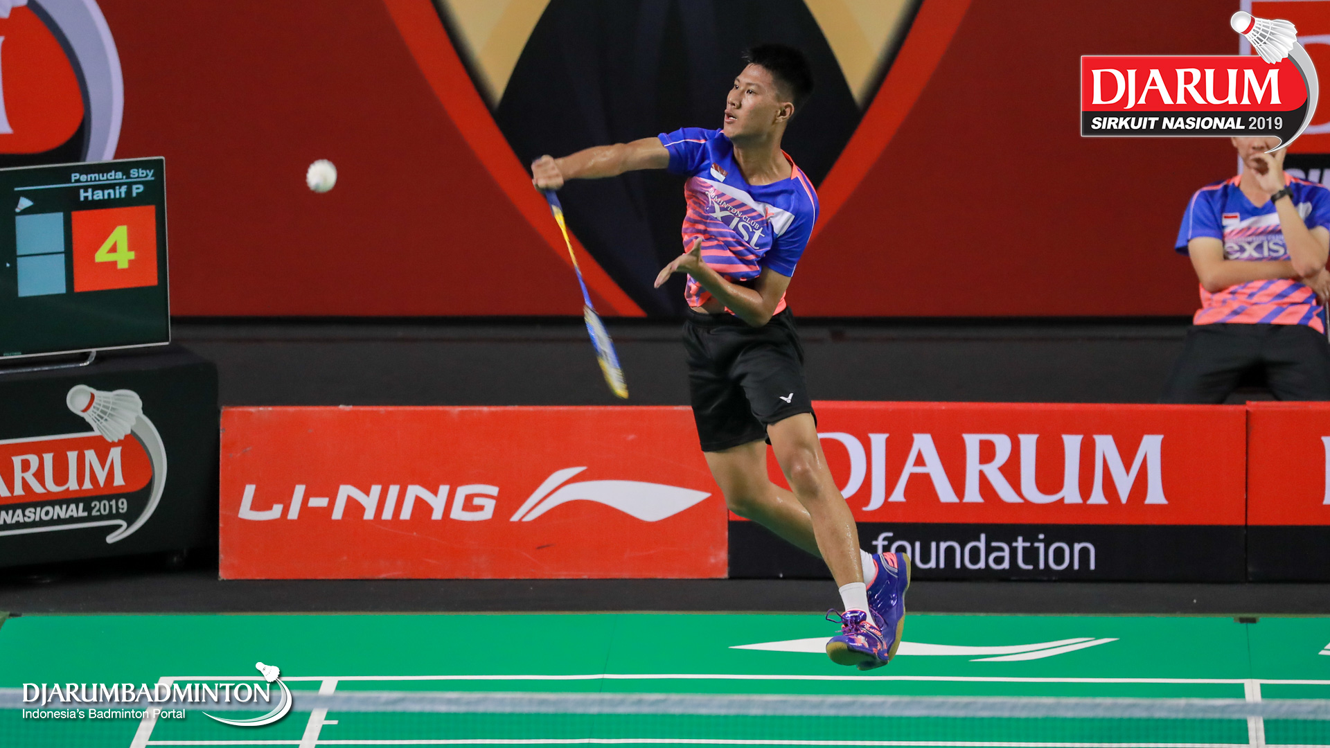 Hanif Pramadhani (Pemuda, Sby) mengembalikan shuttlecock