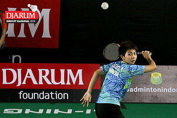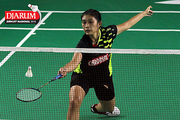 Choirunnisa (Mutiara Cardinal) mengembalikan shuttlecock.