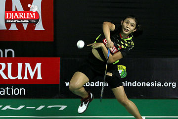 Febby Angguni (Pertamina Fastron) mengembalikan shuttlecock.