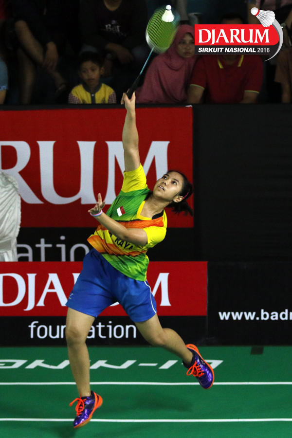 Esra Narulia (Jaya Raya) mengembalikan shuttlecock.