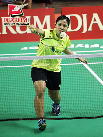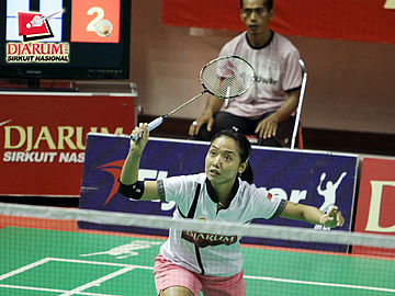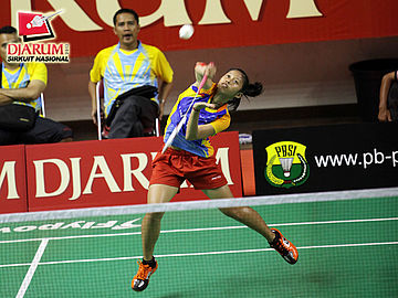 Dian Fitriani (Pusdiklat Jaya Raya) melepaskan smash keras ke arah Ana Rovita (PB Djarum Kudus).