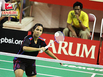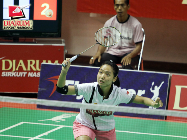 Ana Rovita (PB Djarum Kudus) menyambar bola tanggung dari Dian Fitriani (Pusdiklat Jaya Raya).