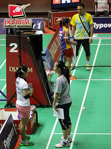Ana Rovita (PB Djarum Kudus) dan pelatih (bawah) serta Dian Fitriani (Pusdiklat Jaya Raya) dan pelatihnya (atas) saling menyusun strategi di sela-sela waktu istirahat.